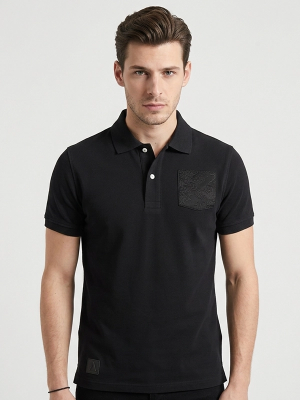 Confeccionado en algodón piqué estructurado, combina comodidad y presencia en una silueta limpia y atemporal. El detalle protagonista es su falso bolsillo bordado al tono con un fragmento de tela damasco, integrado de forma sutil en el pecho.