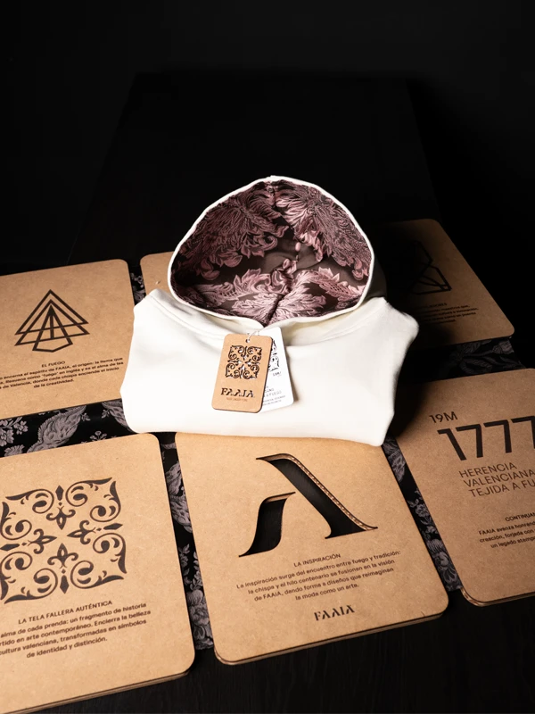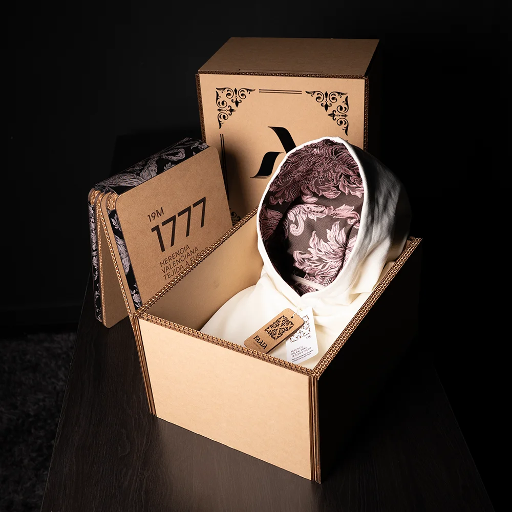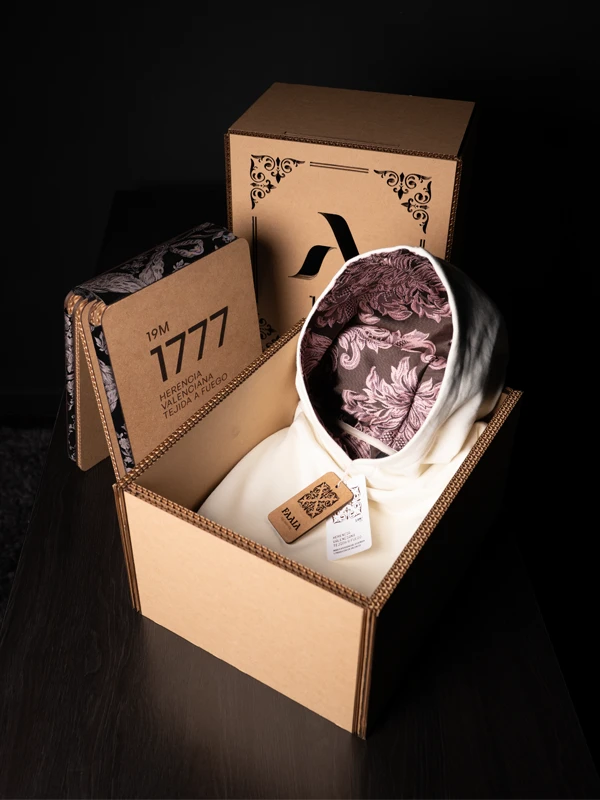 Al abrir el estuche no solo aparece una sudadera: surge un legado. El tacto del algodón, la nobleza del plegador de madera y el damasco valenciano… cada elemento está pensado para despertar orgullo, emoción y memoria textil.
