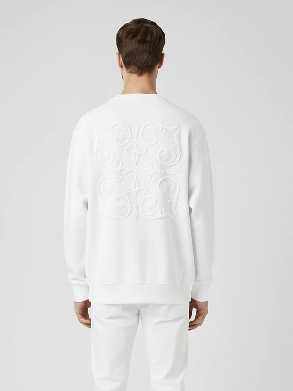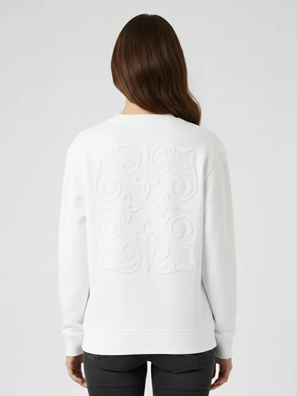 Ornamento valenciano bordado tono sobre tono en sudadera blanca Faaia.